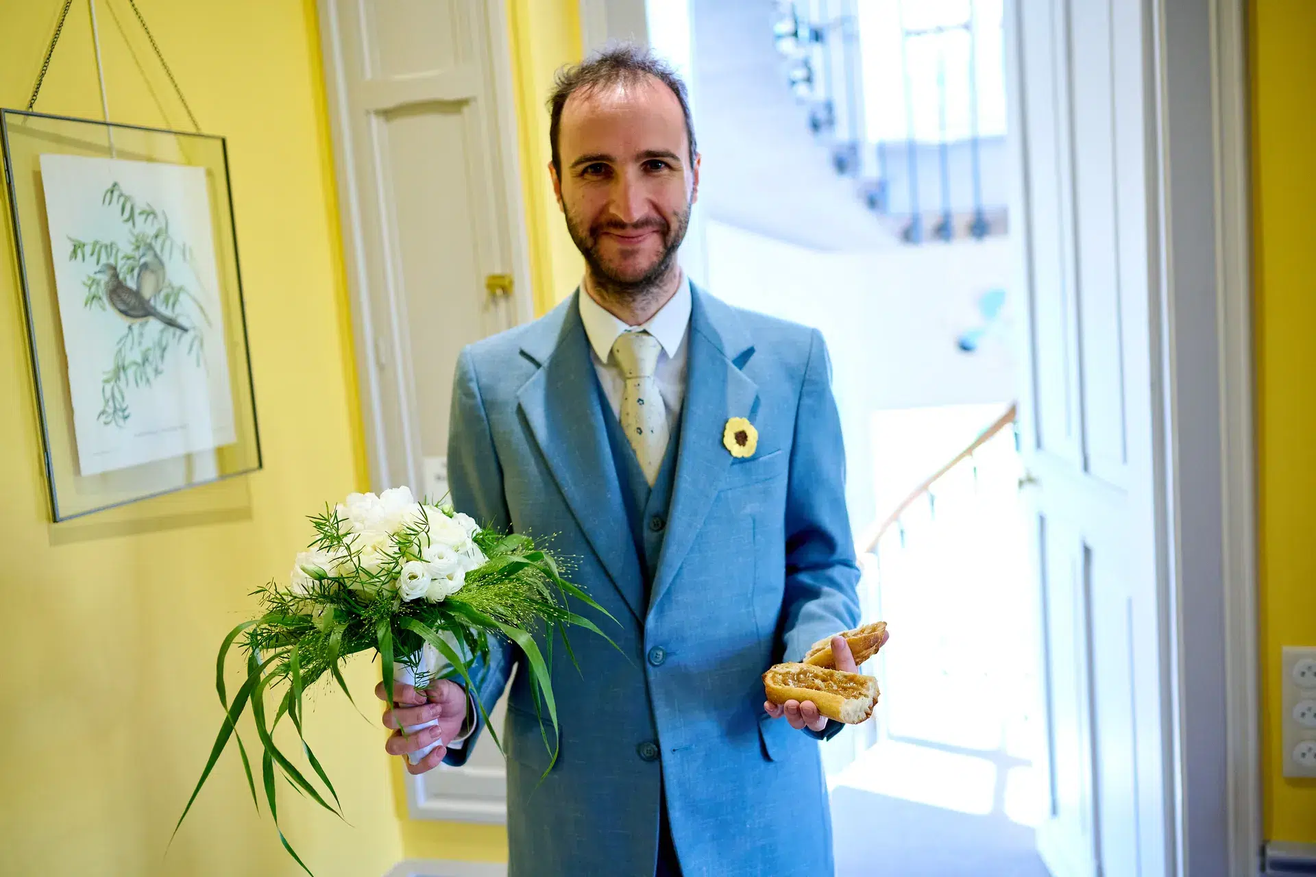 Après un court moment d’attente devant la salle des mariages, le temps que le mariage précédent se termine, c’est au tour de Caroline et Virgile de faire leur entrée. Virgile, visiblement ému, a ouvert la marche, attendant avec impatience l’arrivée de sa future épouse.